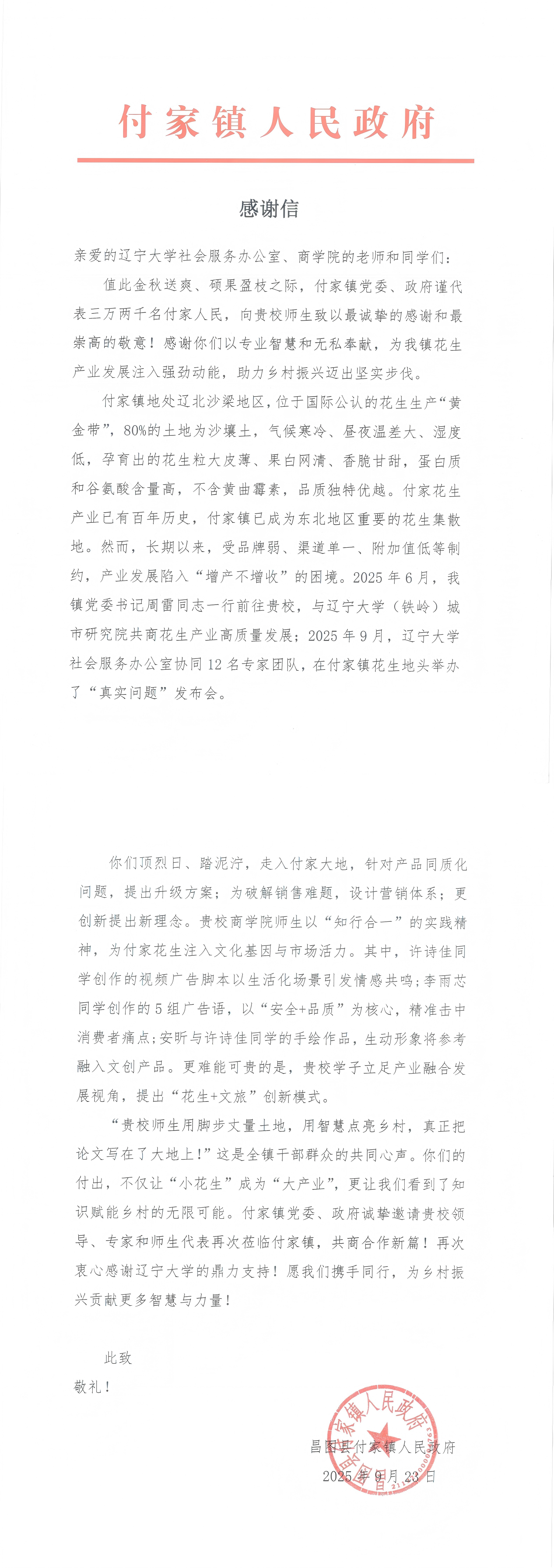 9月23日,昌图县付家镇人民政府向五大联赛买球网师生发来感谢信,信中对体育买球官方网站社会服务办公室以及五大联赛买球网师生表达了诚挚谢意。