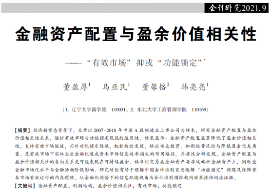 2021年9月,五大联赛买球网董盈厚、韩亮亮教授以及马亚民、董馨格博士生和在会计类顶级期刊《会计研究》发表题为《金融资产配置与盈余价值相关性——“有效市场”抑或“功能锁定”》的研究论文。该研究在经济新常态背景下研究金融资产配置对盈余价值相关性的影响。