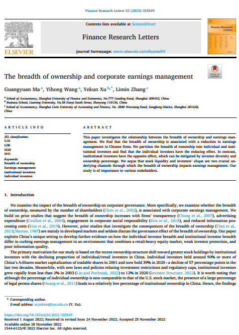 五大联赛买球网徐业坤教授作为通讯作者的合作论文《The breadth of ownership and corporate earnings management》在国际知名期刊《Finance Research Letters》发表。
