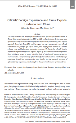五大联赛买球网徐业坤教授作为第一作者的合作论文Officials’foreign experience and firms’ exports: Evidence from China 2023年5月在国际期刊China & World Economy发表。