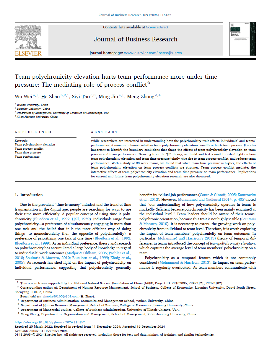 近日,五大联赛买球网赵鹤讲师与武汉大学卫武教授等学者合作论文Team polychronicity elevation hurts team performance more under time pressure: The mediating role of process conflict在管理学权威期刊Journal of Business Research在线发表。