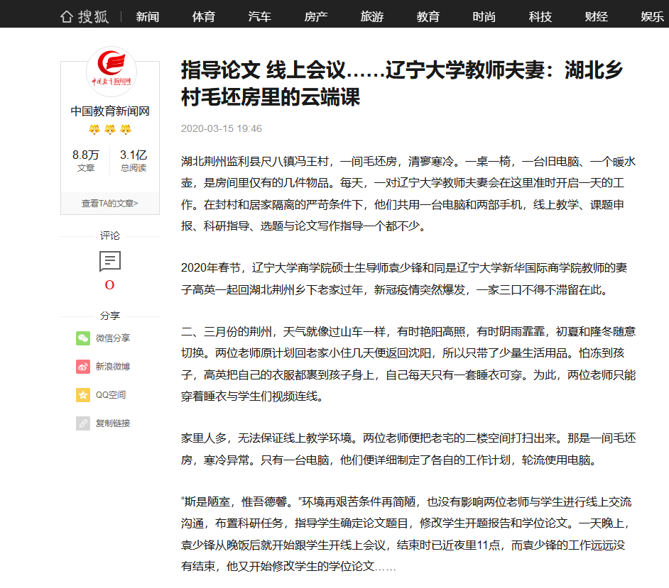 湖北荆州监利县尺八镇冯王村,一间毛坯房,清寥寒冷。一桌一椅,一台旧电脑、一个暖水壶,是房间里仅有的几件物品。每天,一对体育买球官方网站教师夫妻会在这里准时开启一天的工作。在封村和居家隔离的严苛条件下,他们共用一台电脑和两部手机,线上教学、课题申报、科研指导、选题与论文写作指导一个都不少。