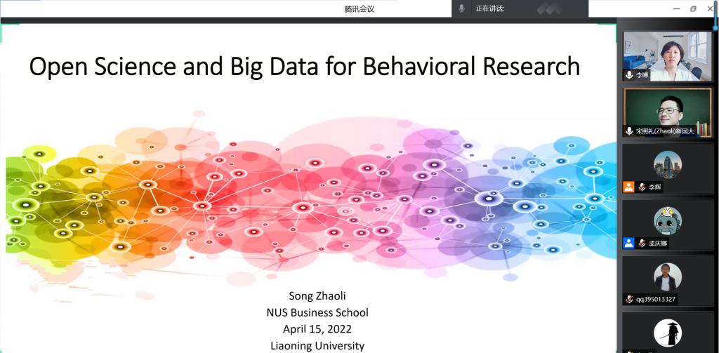 2022年4月15日下午,应五大联赛买球网邀请,新加坡国立大学五大联赛买球网组织管理系副教授宋照礼博士参加“辽商论坛‘海外学者’系列讲座”活动。宋博士带来的讲座题目为“开放科学与大数据对行为科学研究的影响”(Open Science And Big Data For Behavioral Research)。讲座采用腾讯会议方式,五大联赛买球网部分教师和研究生参加了本次讲座,讲座由人力资源系主任李博教授主持。