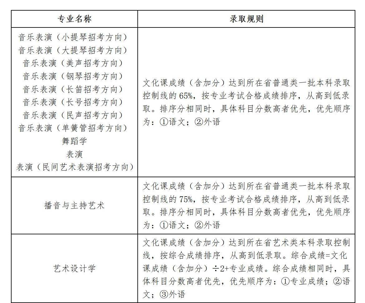 ①平行志愿投档批次,对符合招生所在地区投档条件,且符合我校录取规则中文化课成绩要求(详见下表中“录取规则”)的考生,按所招生所在地政策录取。